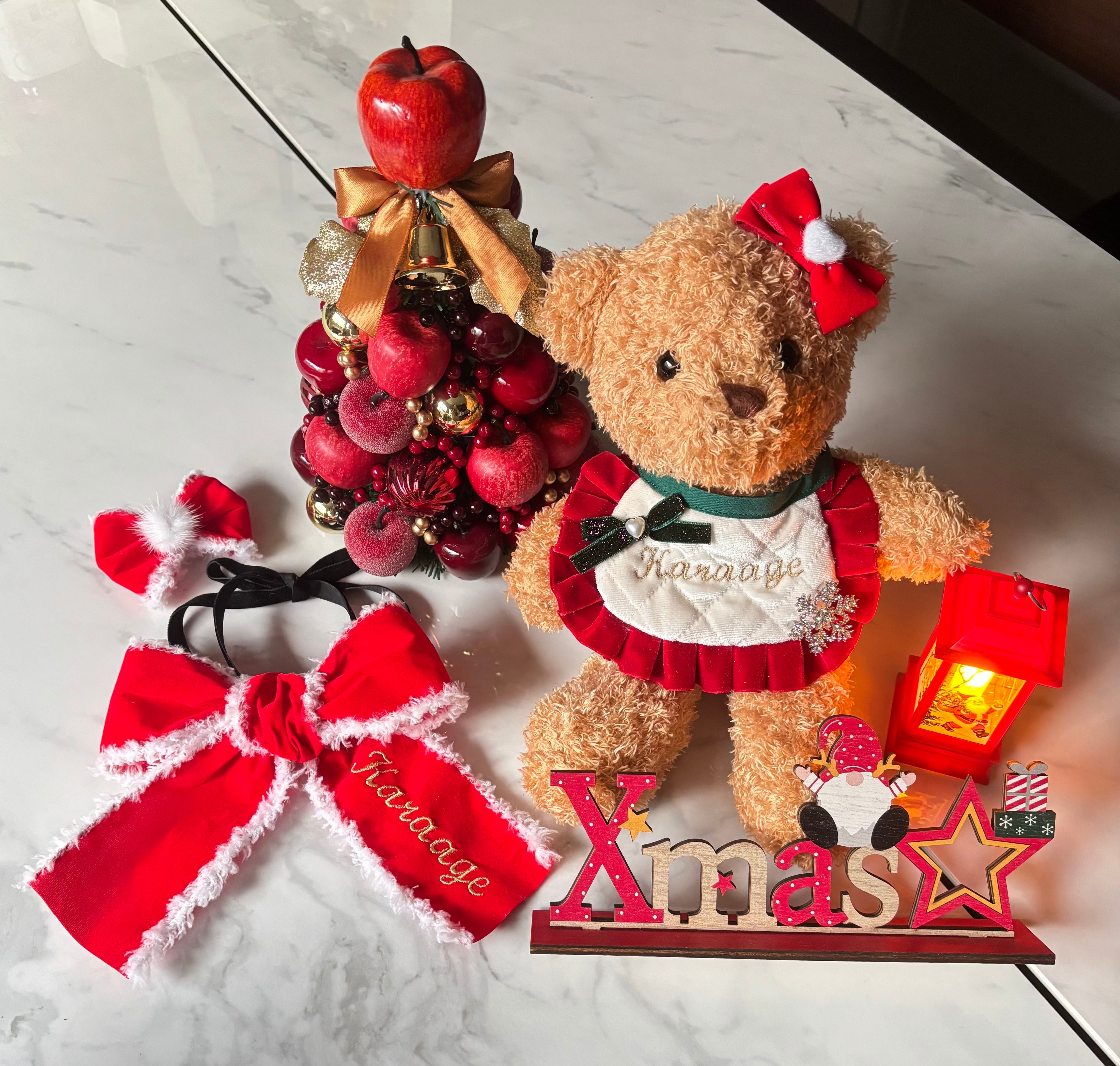 クリスマススタイ2025☆ カスタム出来るスタイですので、 お気に入りの1枚を見つけてください♡ お名前刺繍はフォントと刺繍糸のカラーをお選び頂けます。(画像12.13.14枚目参照) ※クマ着用の刺繍糸はゴールドラメ糸、 フォントは⑤を使用 ◇サイズ 小さめサイズ:横約15cm縦約10cm 標準サイズ:横約17cm縦約11cm ※希望のサイズが完売の際はお問い合わせください 首紐の長さ:55㎝〜70㎝(5㎝刻みで選択可) ◇カスタムオプション グリーンのベロアリボンはラメありとラメなしから選べます。 リボンのハートパールも有無を選択可能◎ キラキラ雪の結晶ブローチは取り外し可能となっております。リボンは縫い付けてあります。 ※オプション無しは画像10枚目です(シンプルがお好きな方やパーツの誤飲が心配な方にオススメ) おそろいのバレッタはこちら↓ https://handmade.inflame.co.jp/items/124620269 《利用規約》https://handmade.inflame.co.jp/blog/2024/08/28/004803