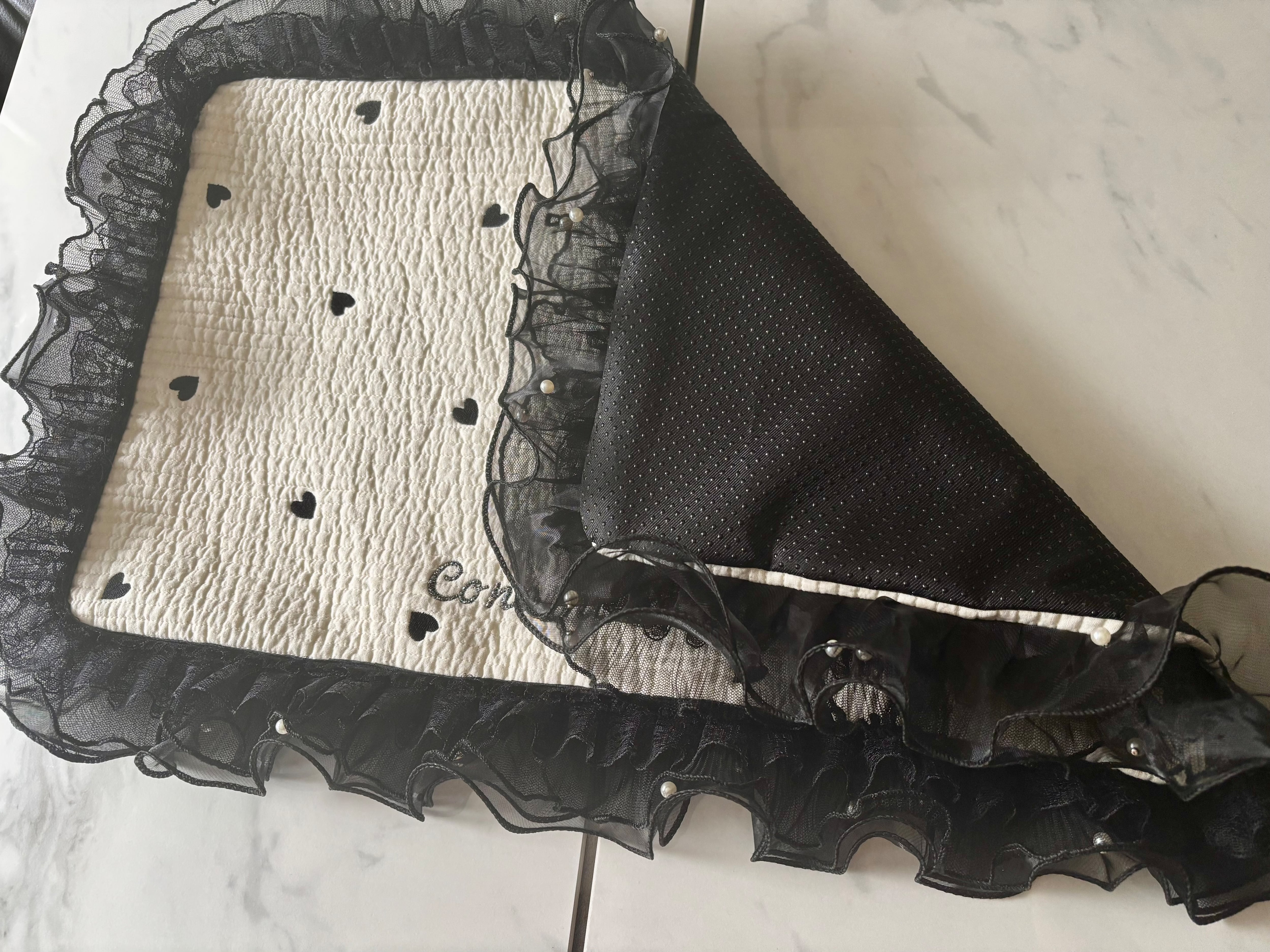 フリル部分がボリュームたっぷりな、ハート柄の長方形カフェマット♡