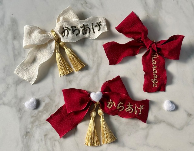 【単品販売・ケープ購入者限定】 取り外しリボンシリーズ専用|リボン単品ページ こちらは、当店の取り外しリボン付きケープをご購入いただいた方限定でご案内している、 リボン単品の販売ページです♡ ・ケープをすでに購入済みでリボンを追加したい方 ・色違いのリボンを楽しみたい方 そんな方に向けてご用意いたしました♧ ※当店のケープを一度もご購入いただいていないお客様からのご注文は、キャンセルさせていただく場合がございます。あらかじめご了承ください。 ⸻ 【取り外し可能な仕様・当店の他ケープにも対応】 リボンは回転ロック式の安全ピンで、簡単かつ安全に取り外し可能。 今後発売予定のケープにも共通で付け替えて楽しめる設計となっております♫ ※ご使用時には、安全ピンのロックが確実に閉まっていることをご確認ください。 ⸻ 【お名前刺繍オプション】 リボン表面には、お名前刺繍を追加できるオプションをご用意しています。 大切な子の「特別な1本」に仕上げたい方におすすめです☆ 刺繍オプションを選択された方は、以下の情報をご選択ください。 ・刺繍糸カラー ・フォント番号(①〜⑤) 刺繍サンプルは、4〜5枚目の画像をご参照ください。 (参考:掲載リボンはすべて黒×シルバーラメ糸/フォント④を使用) ⸻ 【サイズについて】 ・リボンサイズ:横幅 約10cm ※お名前が長い場合や全て大文字希望の場合は、リボンの垂れ部分がやや長くなったり、刺繍文字が少し小さくなることがあります。 ±3cm程度のサイズ調整は可能です。 ご希望がある方は、備考欄にてお知らせください。 ⸻ 【ご購入前に必ずご確認ください】 > ご利用規約 https://handmade.inflame.co.jp/blog/2024/08/28/004803